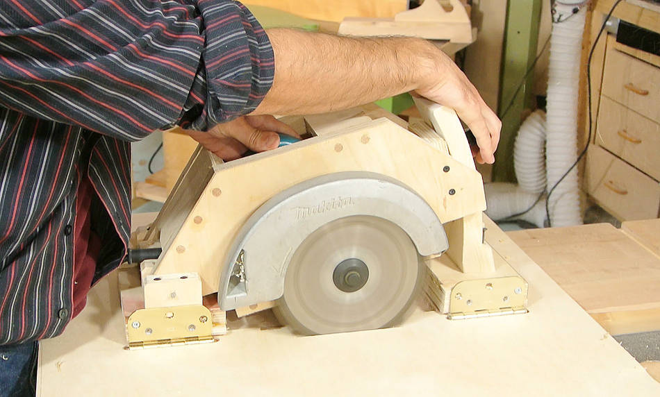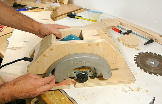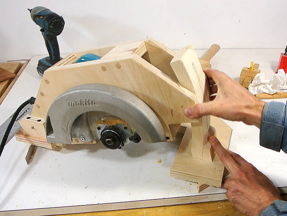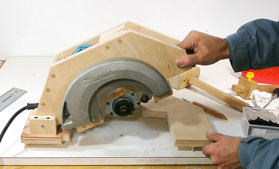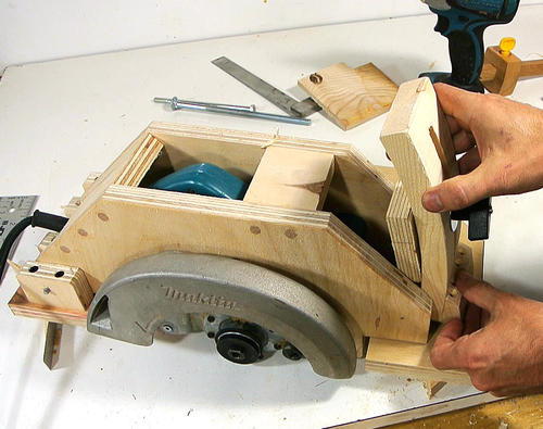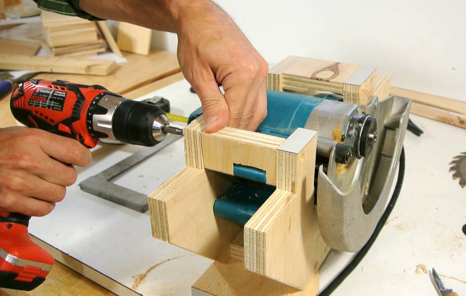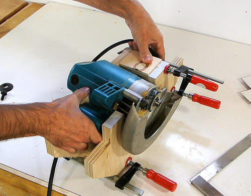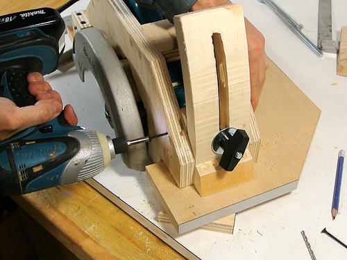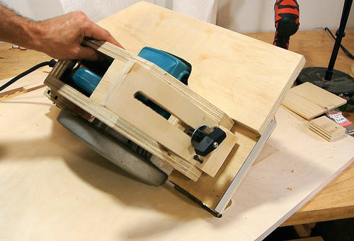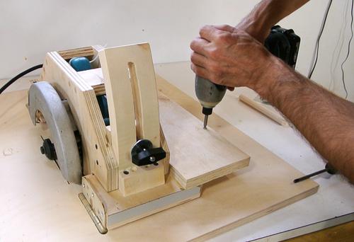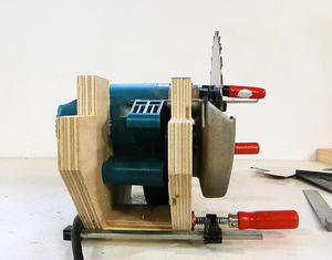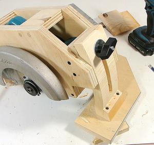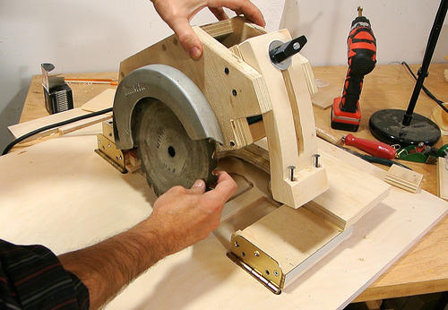 J'ai visionné pas mal de vidéos de scies circulaires stationnaires "maison" sur Youtube ("homemade table saws"). La plupart du temps c'est simplement une scie circulaire portative vissée au dos d'une planche de contreplaqué. L'idée est bonne mais elle présente deux inconvénients majeurs: il est difficle de régler la hauteur de la lame et on ne peut pas faire de coupe de biais.
