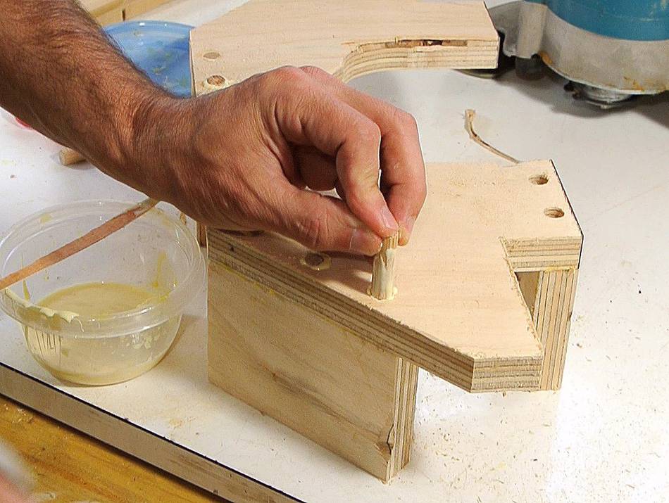 J'assemble un côté du support avec de la colle et des tourillons, mais j'utilise des vis de l'autre côté pour permettre des modifications si nécessaire.