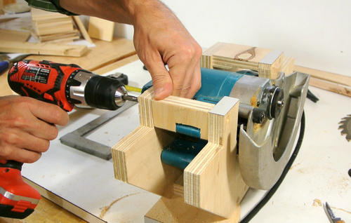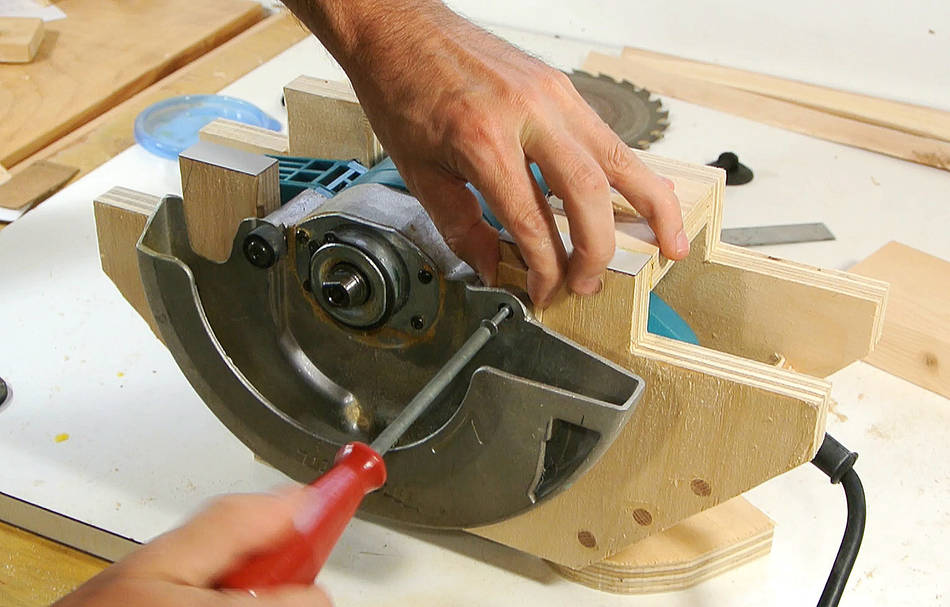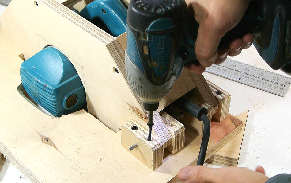 En attendant de pouvoir régler l'inclinaison de la scie, je visse tout pour que ça ne bouge pas.