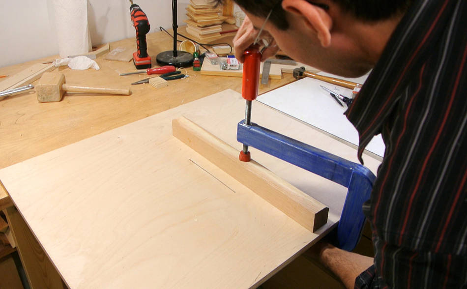 Je retourne la table et j'installe le guide de coupe grâce à un serre-joint extra-long