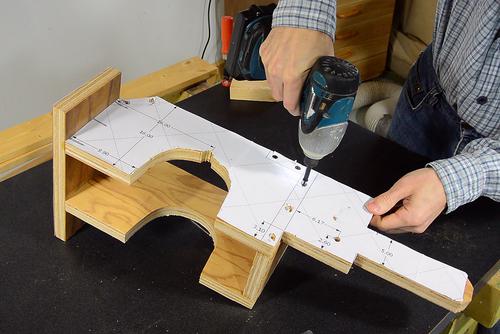 Screwing it on. I used 1.25" #8 screws, and a larger (probably #12) screw for the hole that used to hold the depth adjustment lock.