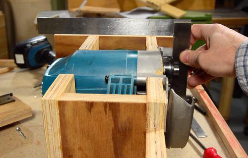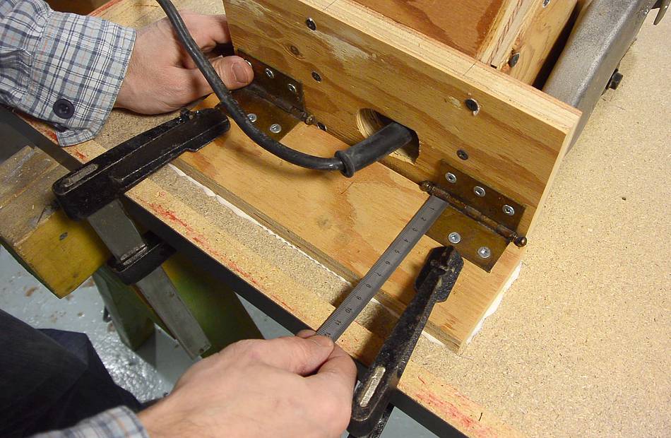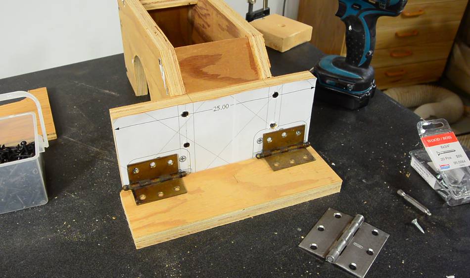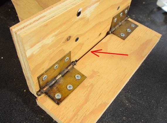 The hinges for the depth adjustment mount onto a block of wood, which in turn