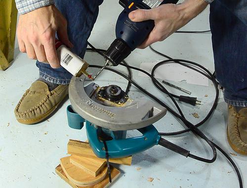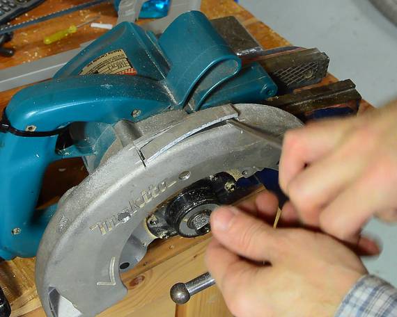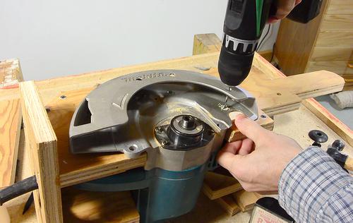 Now drilling new mounting holes in the guard of the saw.
