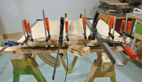 I had the idea of making this piece arch upwards slightly as I glued it to compensate for a probable downward sag over time from the weight of the saw. I had some success with this technique for compensating for fixing sag in a shelf.