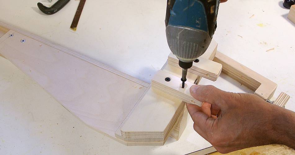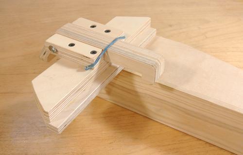 A C-clamp would be better, but C-clamps that open up far enough are bulky and heavy. So I made my own clamp. I glued two pieces of plywood together to get something 30 mm thick to cut the clamp out of.