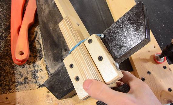 The rubber band is hooked around two screws in the ends of the blocks on either