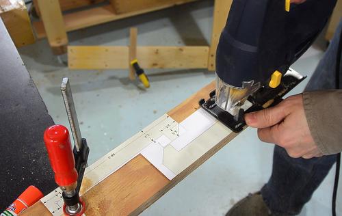 Cutting out two layers for the fence clamp. The jigsaw is not an ideal