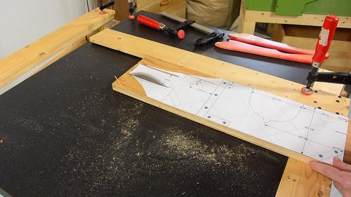 I cut out the individual templates and pasted them onto scraps of wood that were big enough, then cut them out. I'm just using scraps of medium quality plywood from the garbage, not the fancy Baltic birch plywood, because I want to make sure this saw can be built cheaply.