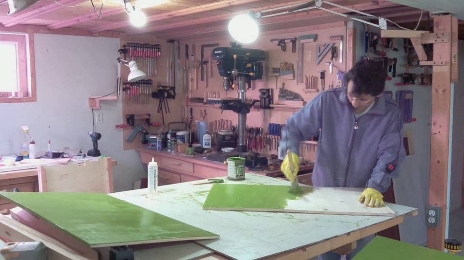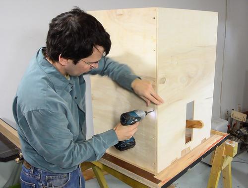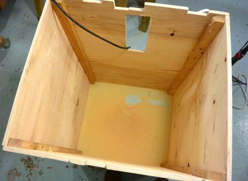 The rails also help keep the really cheap plywood flat. The wood was very rough, and I had to sand it quite a bit to get it even moderately smooth. A sturdy cardboard box from an appliance like a dishwasher or bar fridge might make a good stand, but didn't come across such a box, and I already had the plywood which I couldn't use for much else.