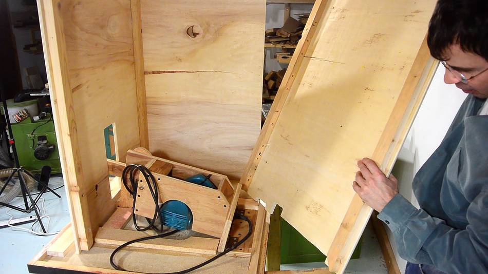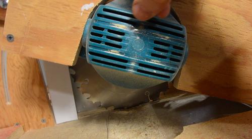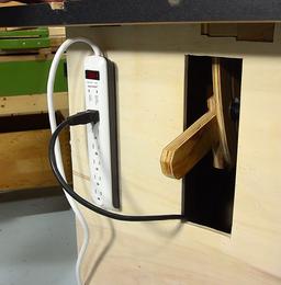 It's often been suggested, for my other saw, that I connect the motor inlet to the outside of the case with a short piece of dryer hose. That would solve the problem, but it would be a bother to deal with. Also, by pulling fresh air into the enclosure, it would also force dusty air out. If you build a saw like this, and you make an enclosed stand for it, this is something you need to check from time to time. Making the enclosure bigger alleviates the problem to some extent.
