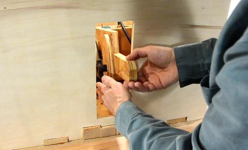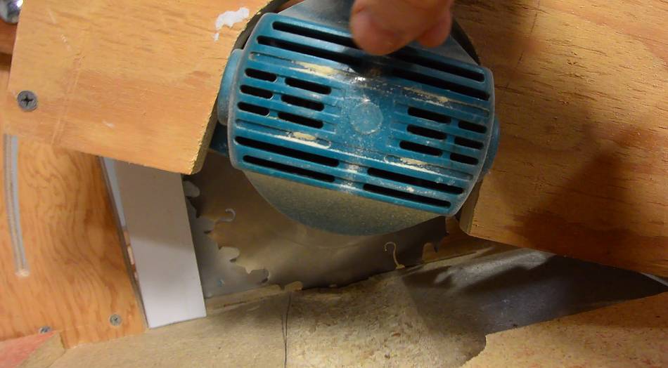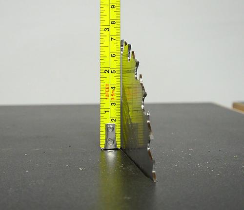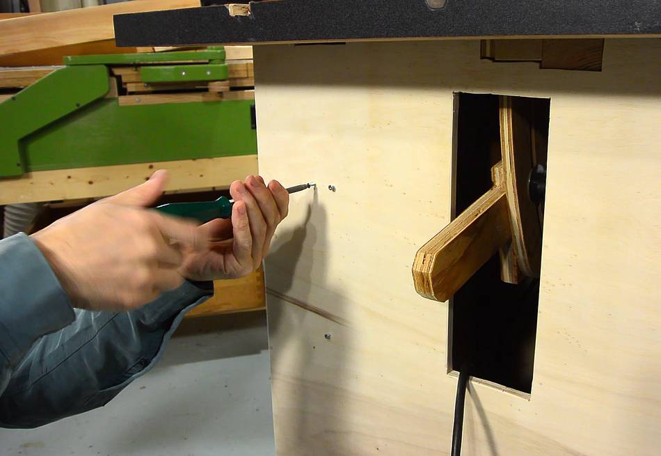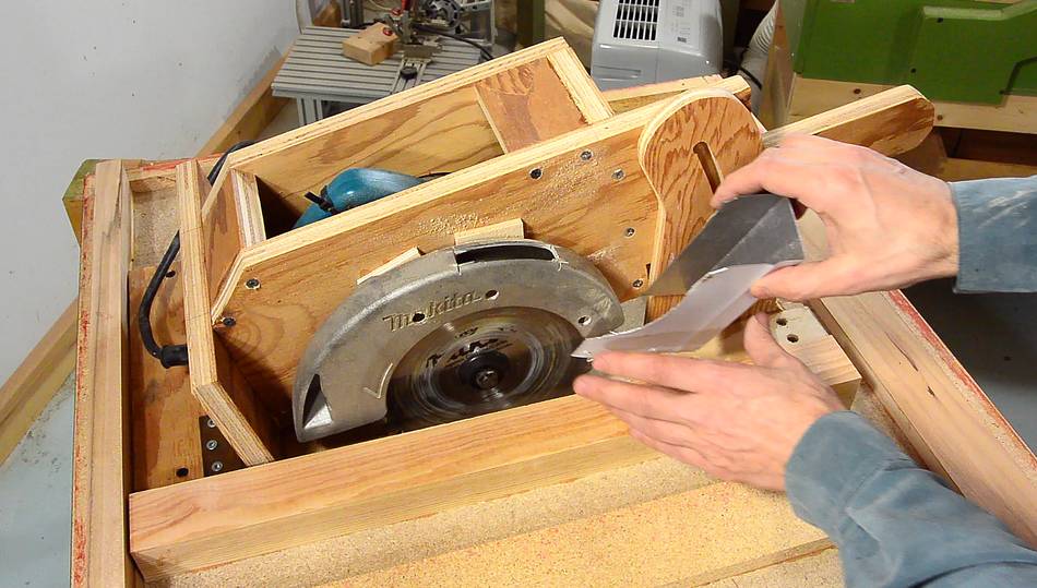 I may route a slot for an insert plate later if the hole around the saw gets too worn. But that will require a router, and I didn't want building this saw to require that you have a router. If I do add a slot, it will probably be only 2-3 cm wide. With no tilt, and blade changes below the table, it doesn't need to be very large. And a bigger slot would also weaken the table. If you want to make your saw with an insert, please see making inserts for my previous table saw.