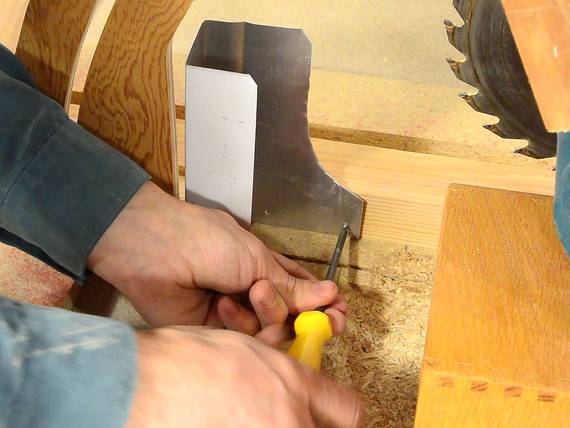 I used a box to prop up the saw while I worked on this. Though in retrospect, it would have been smart to remove the blade as well, just in case it came falling down while putting in the screws. So if this happens to you, don't blame me - I warned you!