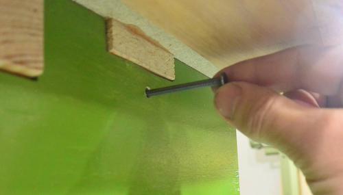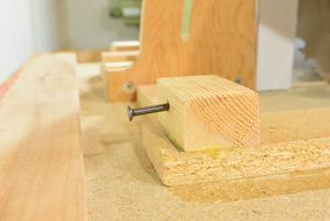 I added some blocks of wood to the bottom of the saw and drilled holes through the stand and saw to insert some pins (nails). These lock the base to the top. The holes are angled downlward slightly, which should keep the pins from coming out with vibration. I used a very long drill bit to be able to drill them without hitting the table. If you don't have a long bit, you could also drill the holes from the inside to get the angle. Next: Table saw alignment See also: