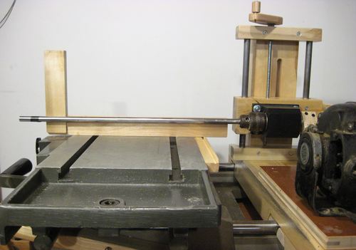 The drill chuck assembly has a 3/4" shaft, and I made a wooden coupling to connect it to the 1/2"