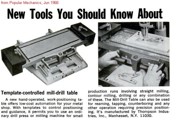 After I built my multi-slot mortising machine, I didn't need my old home-made slot mortising machine anymore. But the XY sliding table that it was based on was too useful a part to be left unused. I originally got the table from a surplus sale. It's totally pre-CNC technology. I found it as a "new product" in a 1968 issue of Popular Mechanics via a Google book search. I also had this fixed drill chuck assembly that I had come across at some point, and between the drill chuck and the XY table, I figured I should be able to build a pretty decent horizontal boring machine.