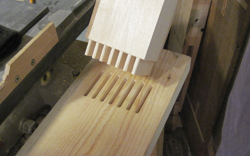 Maybe I went a little overboard making it a septuple (seven) mortise and tenon joint. I cut the multiple mortises with my slot mortiser, and the tenons with my screw advance box joint jig. Once it was set up, making seven mortises didn't add much effort.