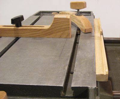 I made a bunch of wooden hold-downs, that attach to the T-slots in the table. I also made two back-stops, which are useful for providing positive stops for positioning the work piece when cutting a series of identical work pieces.