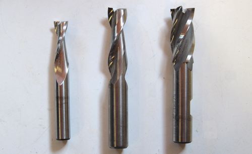 The rightmost bit is a four flute 5/8" end mill, which never worked that well in my slot mortising machine. It's meant to run much slower than a router does. But it works really well running at about 1200 rpm in my horizontal boring machine.