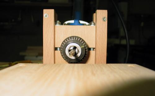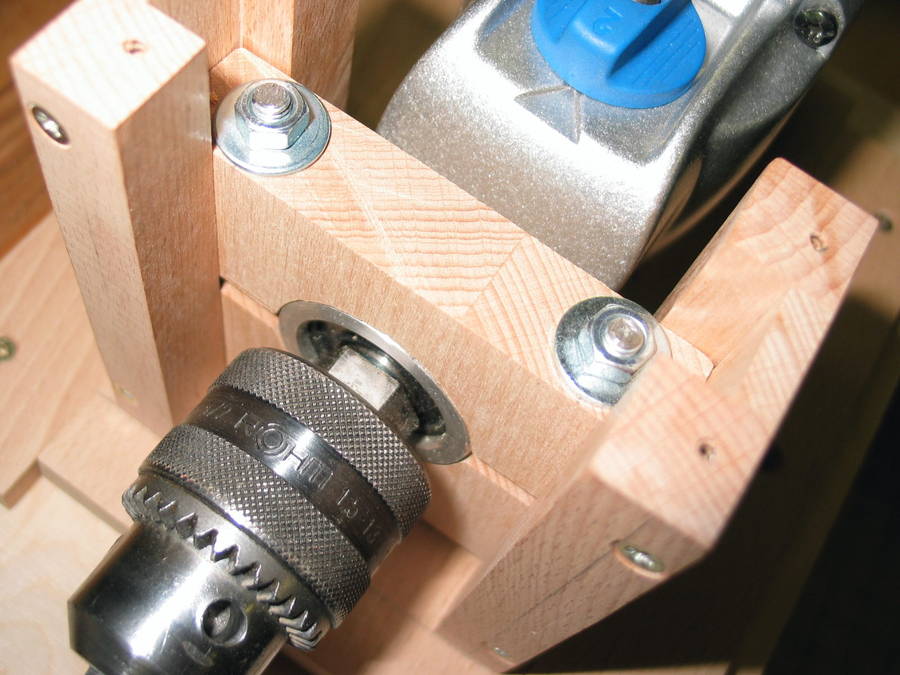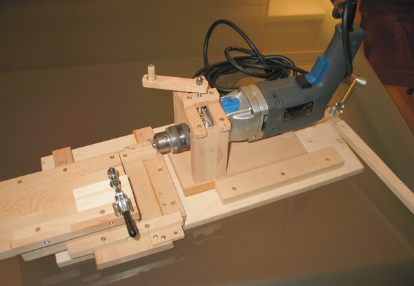 With my own horizontal boring jig, I found it was hard to get the drill to really guide the bit. With hand drills with plastic housings, the main shaft just isn't mounted in the drill rigidly enough. The hand drill Carlo is using is much better than any drill I tried it with, I'm sure this makes for much better results. My own solution to the problem was to build a dedicated horizontal boring machine