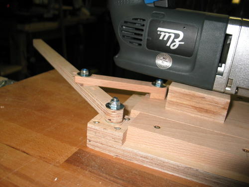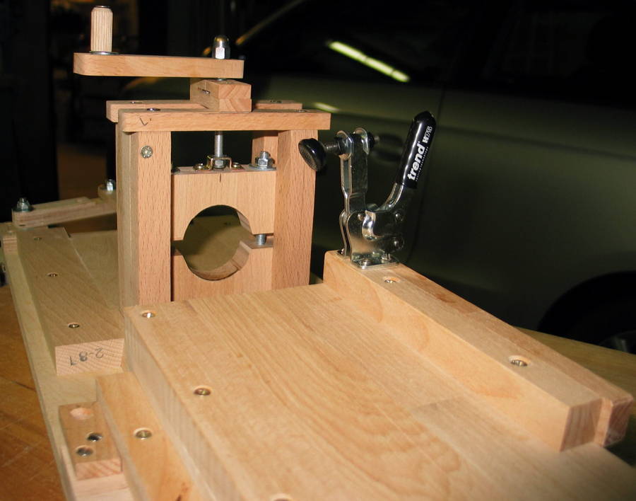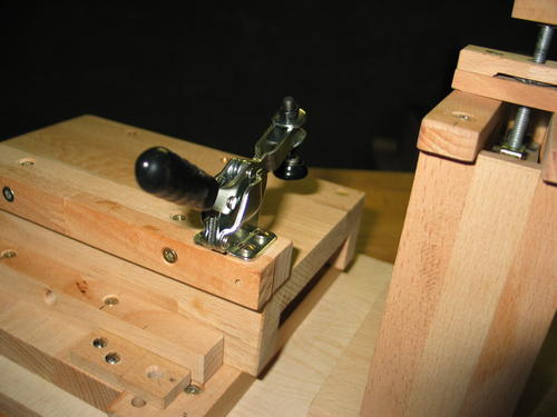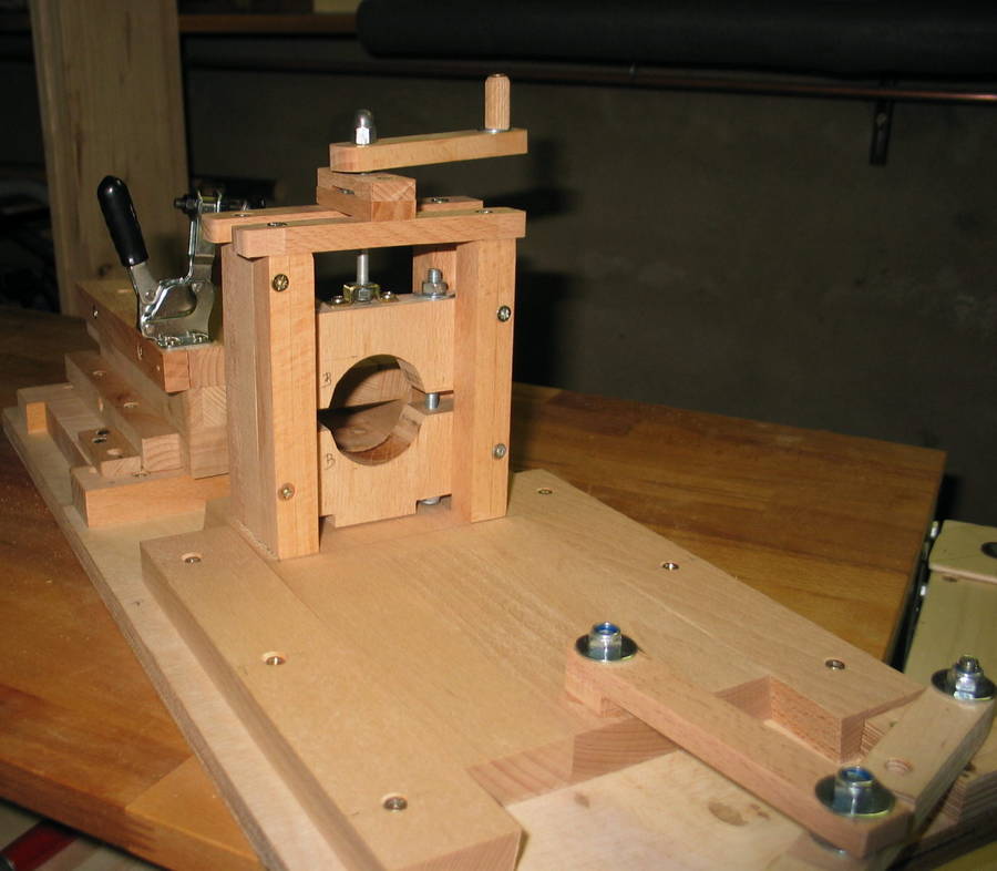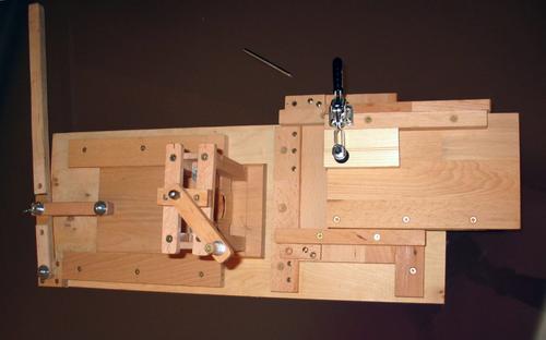 Carlo Reuter sent me some pictures of a horizontal boring jig that he built, inspired by my simple horizontal boring jig. He provided a short description: "The whole device consists of beech wood as well as of plywood. The two sleds with the drill holder and with the work piece slide in a dove tail guide. The height adjustment is operated by turning the crank." A lever is very important - it can take a lot of force to drill, especially when drilling in end grain with a large bit. A crank for moving the drill up and down. You an also see the dovetail slide which allows the drill mount to move forwards and back.