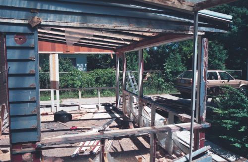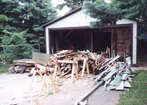 I pulled all the nails out of the reusable framing members and piled them somewhere else. All this junk I put onto the curb one week's worth at a time, and some of it I hauled to the dump in my car. My car was already near the end of its useful life at this point, so I didn't mind abusing it like that.