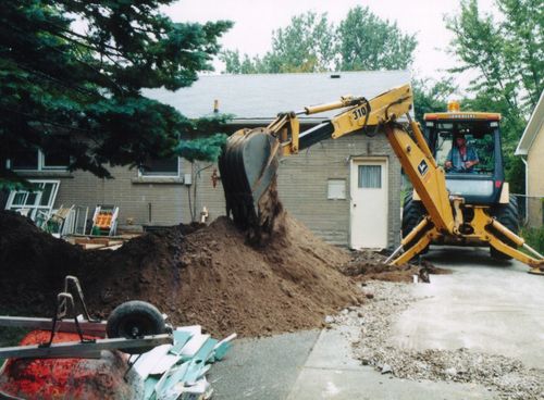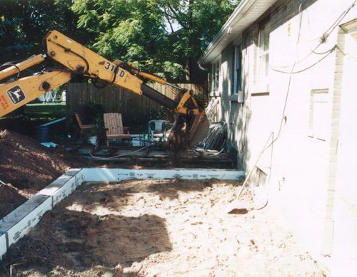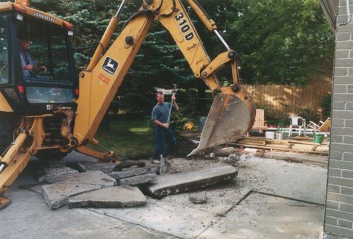 Before the foundation contractor came, I took a sledgehammer to the patio and made a reasonable size hole in it so that the backhoe could pry it up with its shovel. That helped somewhat, but the patio bits still needed to be broken into smaller bits for removal. The backhoe was not as effective at that as I had anticipated. The guy in the middle of the photo was my foundation contractor, wielding a 10-pound sledgehammer. He was a fairly small guy, but I was very impressed by how hard he could swing a 10-pound sledgehammer. I felt like a wimp with my 6-pound sledge.