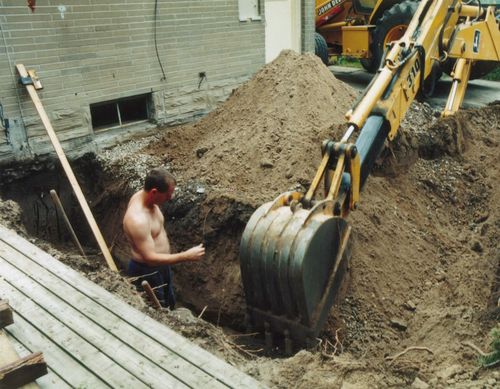 My original discussions with the contractor involved just putting some cement posts all the way down to the frost line and joining them at the top. But when I mentioned "building permit" to my contractor, his response was "You dumb f****, you got a building permit? Now It's gonna cost more!". Now it had to conform to code. So I needed a footing at the frost line all the way around the perimeter. My contractor is the one in the trench, checking the size and depth of the trench. The long board leaning against the wall on the left has a gadget clamped to it that that senses the laser beam from a 360 degree projecting laser level that was set up nearby. It beeps slow if the laser hits the upper part of the sensor and fast if it hits the lower part. Makes for very quick checking of the trench depth. The footing was poured directly into the bottom of the trench, so the depth had to be fairly accurate.