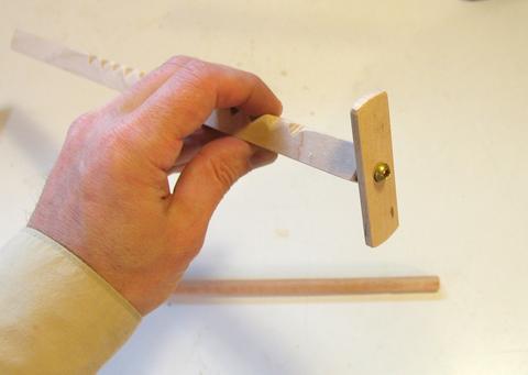 The key to making the propeller turn is how you hold the dowel as you rub it across the notches.