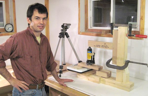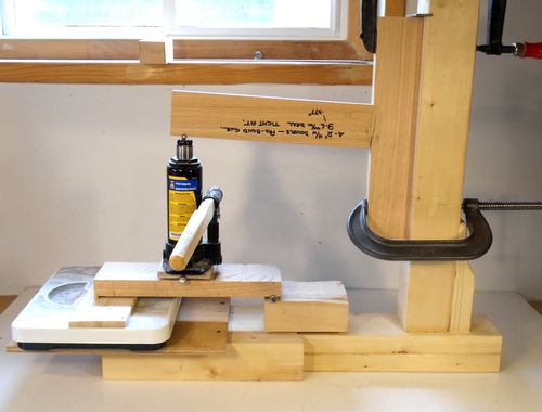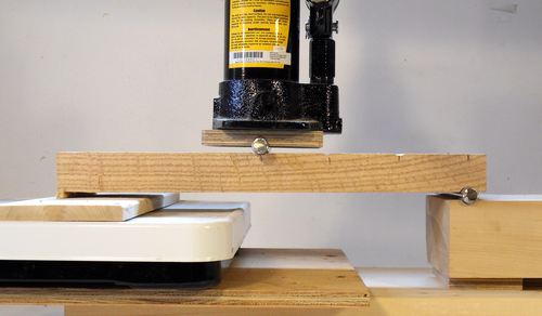 Because my bathroom scale only reads up to 300 pounds, I split the force from the jack between two points, so that only half of the force would press on the bathroom scale. Each pound read by the scale would thus be two pounds applied to the joint. With the pivot 1 foot from the joint surface, each bathroom scale pound works out to two foot-pounds.