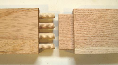 The dowels used were pre-compressed hardwood dowels, 2" in length, with the dowel penetrating into either piece by 1".