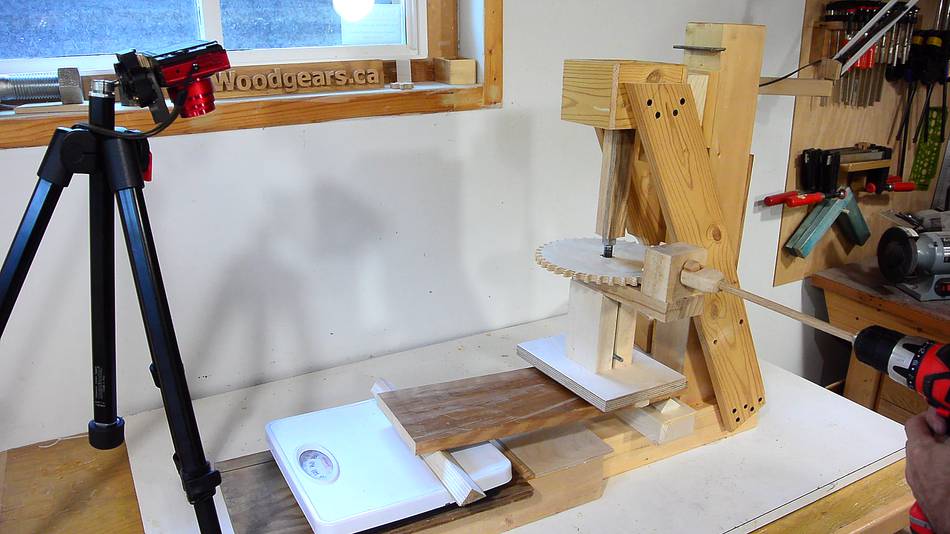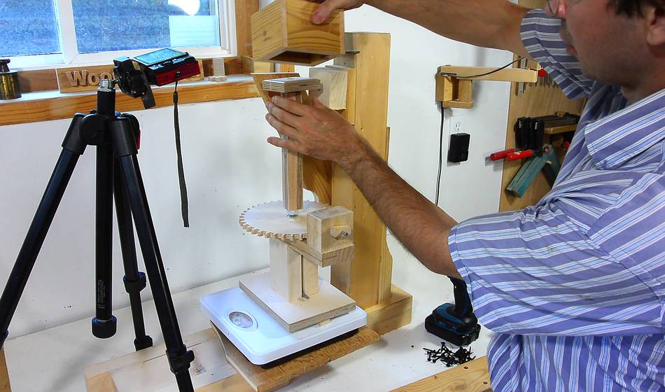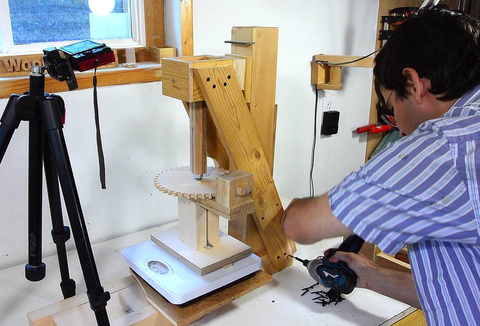 My test setup consists of my screw jack on a bathroom scale,