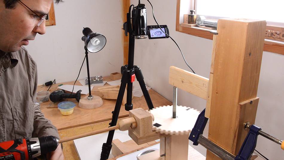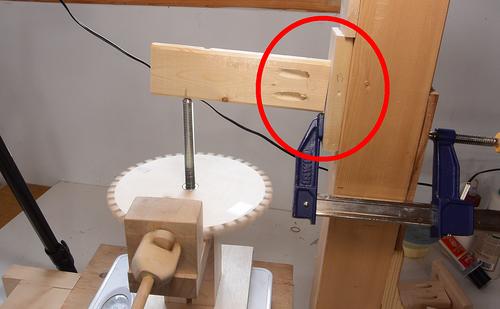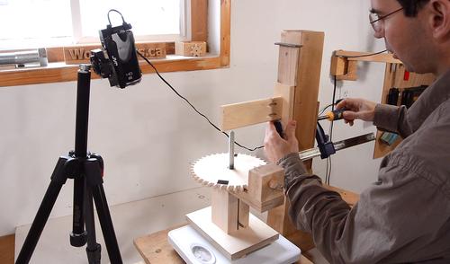 I mounted the test piece in my test apparatus with my new screw jack, on a bathroom scale. I marked 15 cm from the joint for where to apply the force. A video camera is aimed at the scale to record the force.