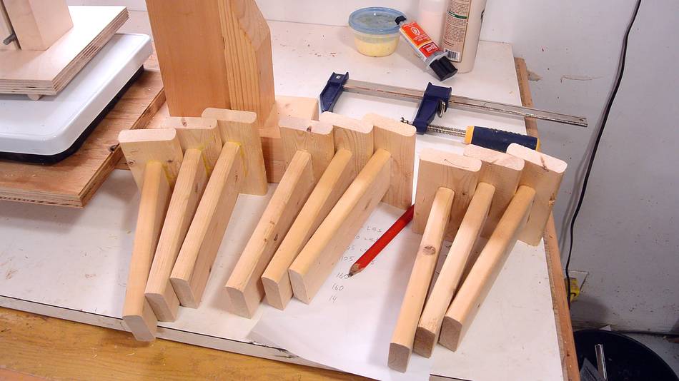 I had a whole lot of scraps, 17 mm x 59 mm, probably spruce, and of consistent density, so I used that for my tests.