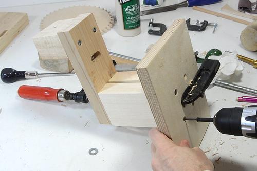 These are just screwed to the top from above. To get the screw holes aligned precisely, I first lined up a block, clamped it in place, then drilled a pilot hole though both parts. Then the same with the other block.