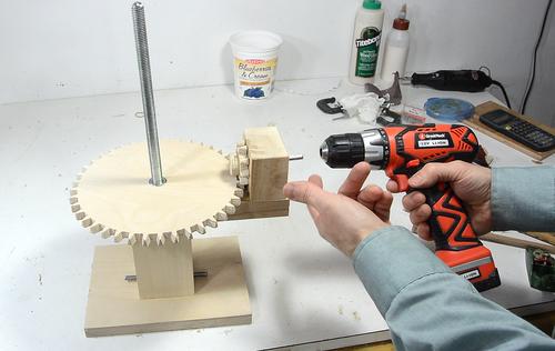 The small gear is to be turned by a drill. But I didn't want to have chuck up