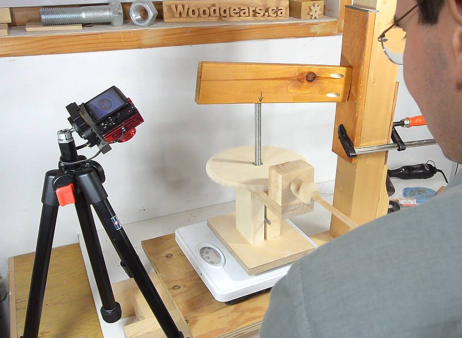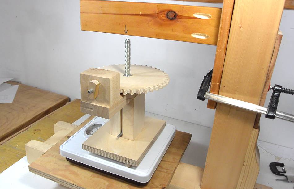 of an L-shaped jig, with a bottle jack to apply the force, on a bathroom scale to