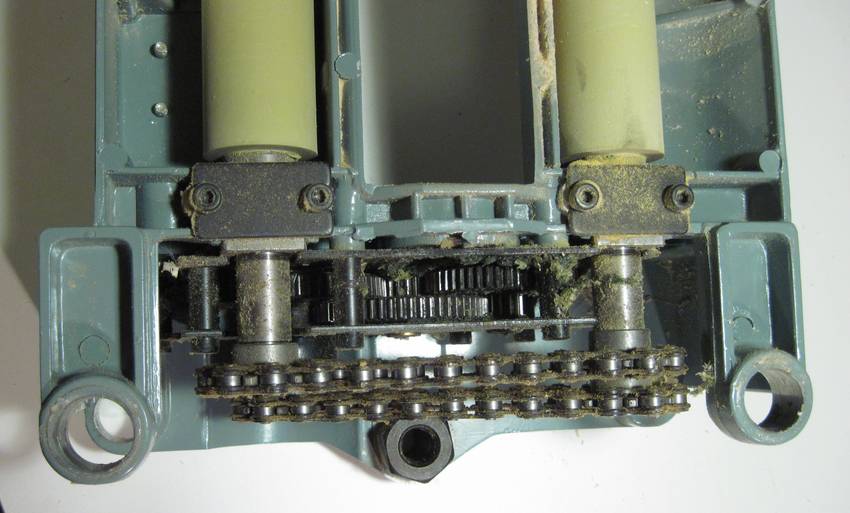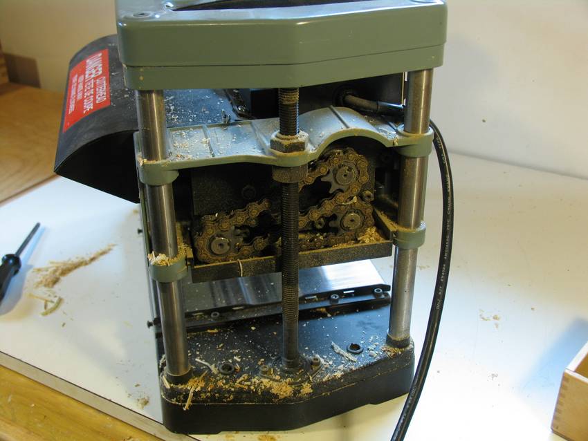 Here's looking at the bottom of the planer head assembly. The chain drive drives two rubber feed