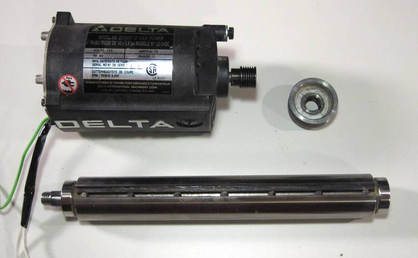 And finally, here are the parts I was after. The cutter head with knives, motor, and bearings. The bearings