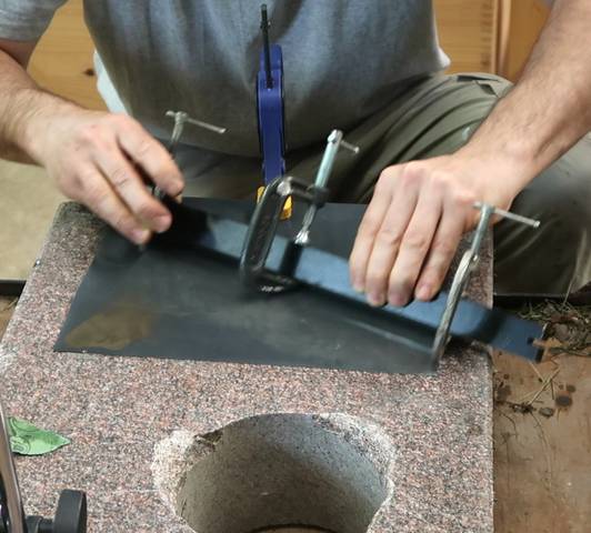 I used three C-clamps to hold the knife to the aluminium and started sharpening.