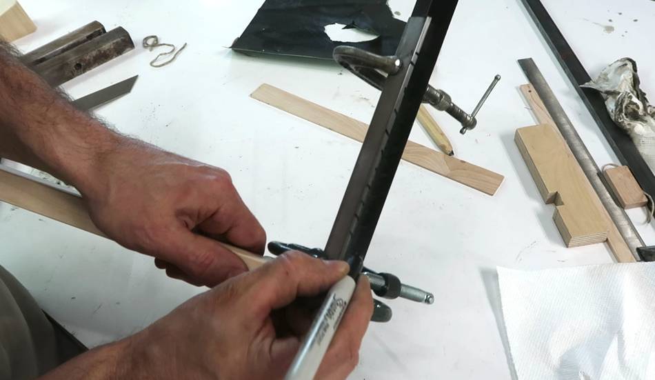 the knive's bevel and comparing it to the outrigger piece I had clamped on.