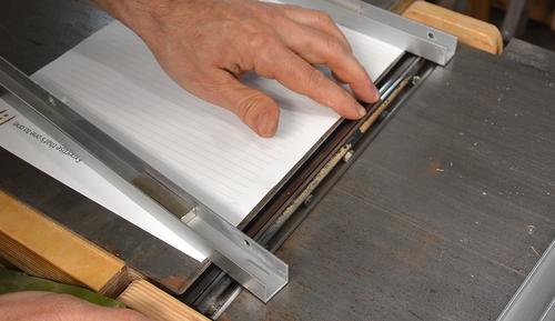 This piece of paper was just the right thickness. And I'm using two aluminium extrusions as a straight edge to get the level on the cutter head, with the edge of the knife directly above the shaft. In the past, I would have used some weights to weigh down these pieces, but I had the idea of putting some magnets into the extrusion to hold them down.
