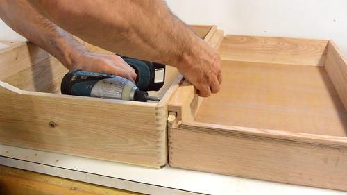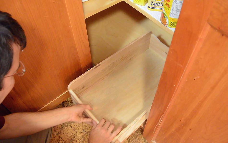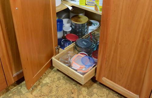 Wheels on the bottom of the boxes, maybe like this drawer, would be even better but they take up a lot of space and are a lot of work to add. That, and the boxes need to slide sideways and in and out.