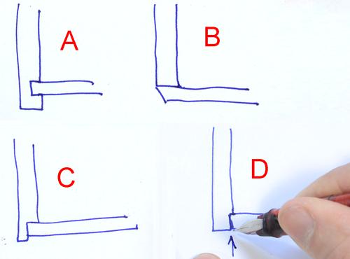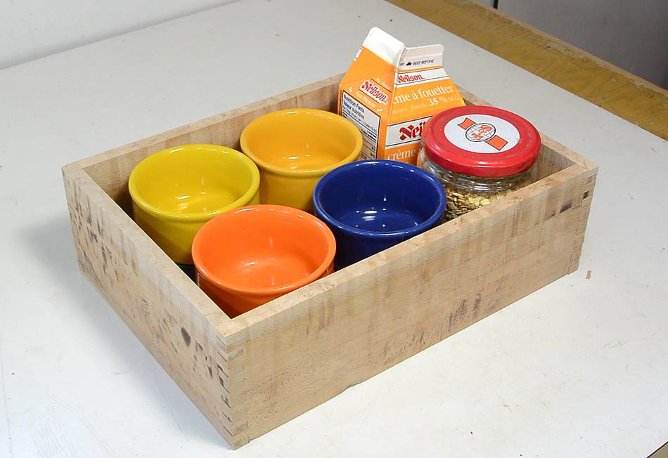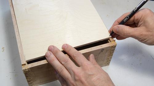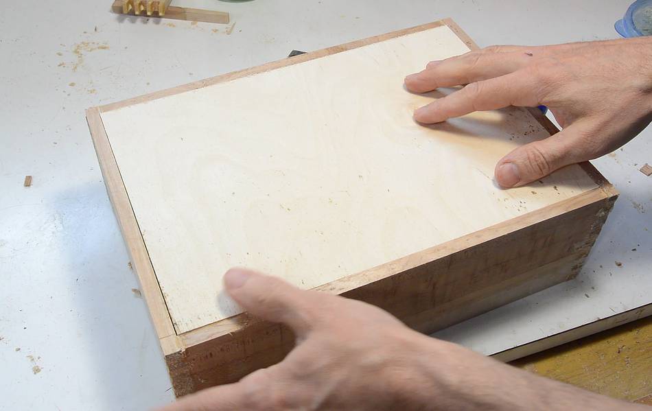 Traditionally, this is done by insetting the bottom in a rabbet (A), but this uses up a lot of height, and is not that strong because the rabbet weakens the side of the box. A simpler and stronger solution is to just glue the bottom on flat (B), but this doesn't look that good, even if the bottom is beveled. I could also rabbet the bottom in (C), but that leaves a relatively narrow piece of side on the bottom. I decided to put the bottom in with a very shallow rabbet (D), though this requires cutting the bottom very precisely so that there is a good glue bond on the surface (pointed at by the arrow). I cut that rabbet on the table saw.