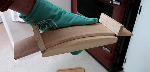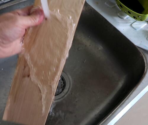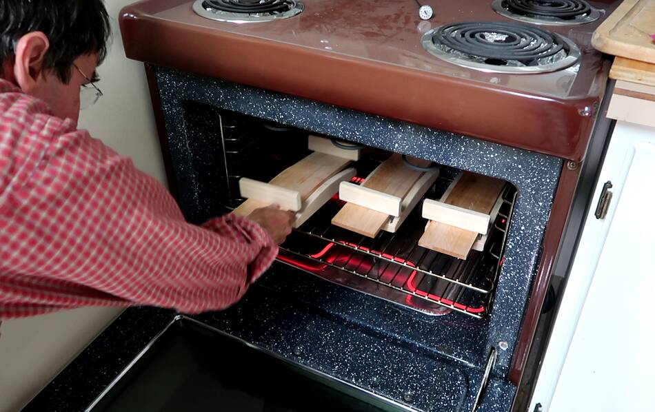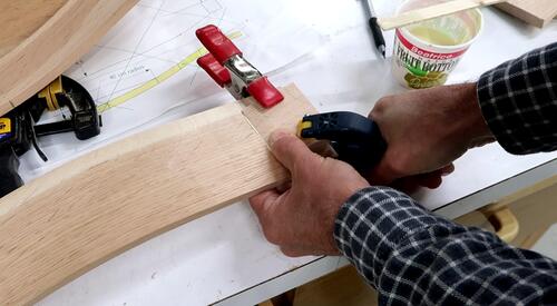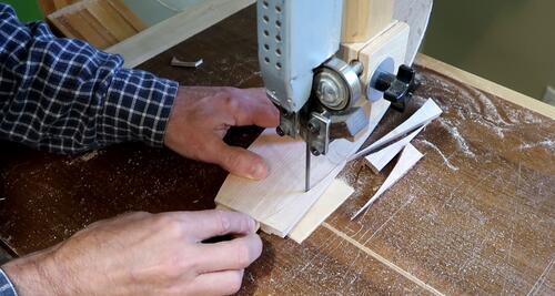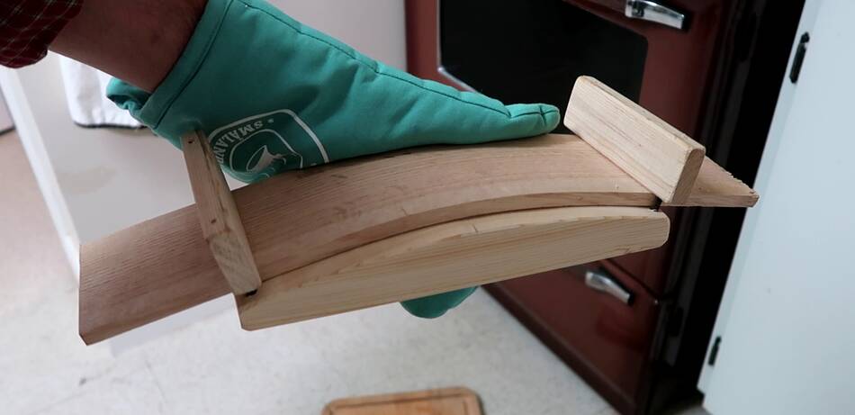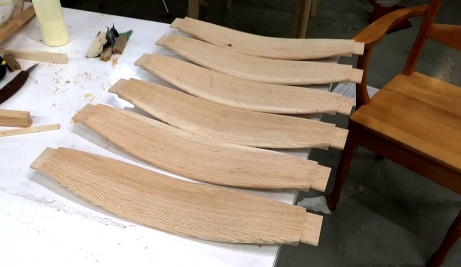 My dad always cut the curved rungs on the back out of a much thicker piece of wood, but I didn't have any pieces of hardwood thick enough for that, so I decided to make them by bending the wood. My preliminary experiment showed that this should work.