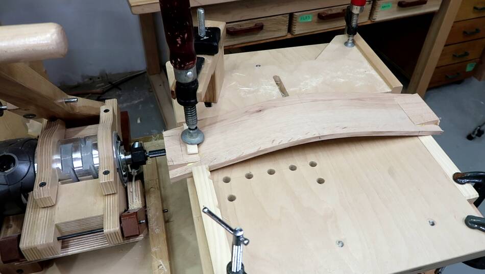 The bending worked better than expected, but securing the bent workpiece to the pantorouter was more trouble than I anticipated. If I was doing this again, I think I'd build a curved form to fully support the workpiece on the pantorouter, so I could clamp it down more firmly without worrying about flexing the workpiece.