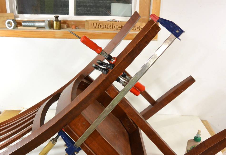 After letting the glue dry for a few hours, I clamped the chair in a vise and