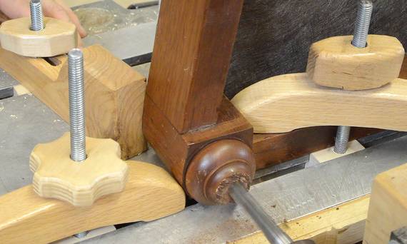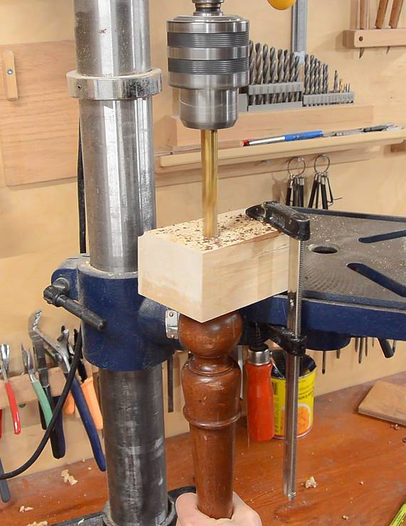 I mounted the leg in my drill press vise and clamped the block to the edge