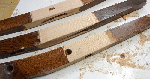I offered to fix some that were beyond just gluing back together, so I took three of the broken back legs and one of the chairs to my shop to fix it.