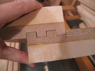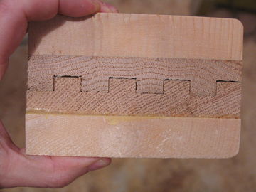 When measuring for cutting the grooves, consistent spacing is very important. If you measure to the blade, mark the tooth that you measure to with a permanent marker. If one of the slots is out by 1/64 of an inch, the grooves may not fit into each other. Proceed by making the next two cuts by again moving the fence away from the blade by 1 3/8" of an inch. The last grove you cut should just cut the rest of the piece away. The final pieces should fit together as seen in Fig 6.