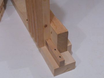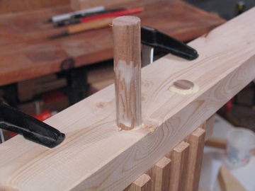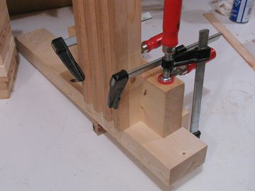Next clean any shavings from the holes, and apply glue to the end of the upright and the mating surface of the table support. Then put the piece back in place, using the block clamped to the upright as a guide, as well as the 4" long piece of scrap to align it the same way it was before, so that the holes line up.